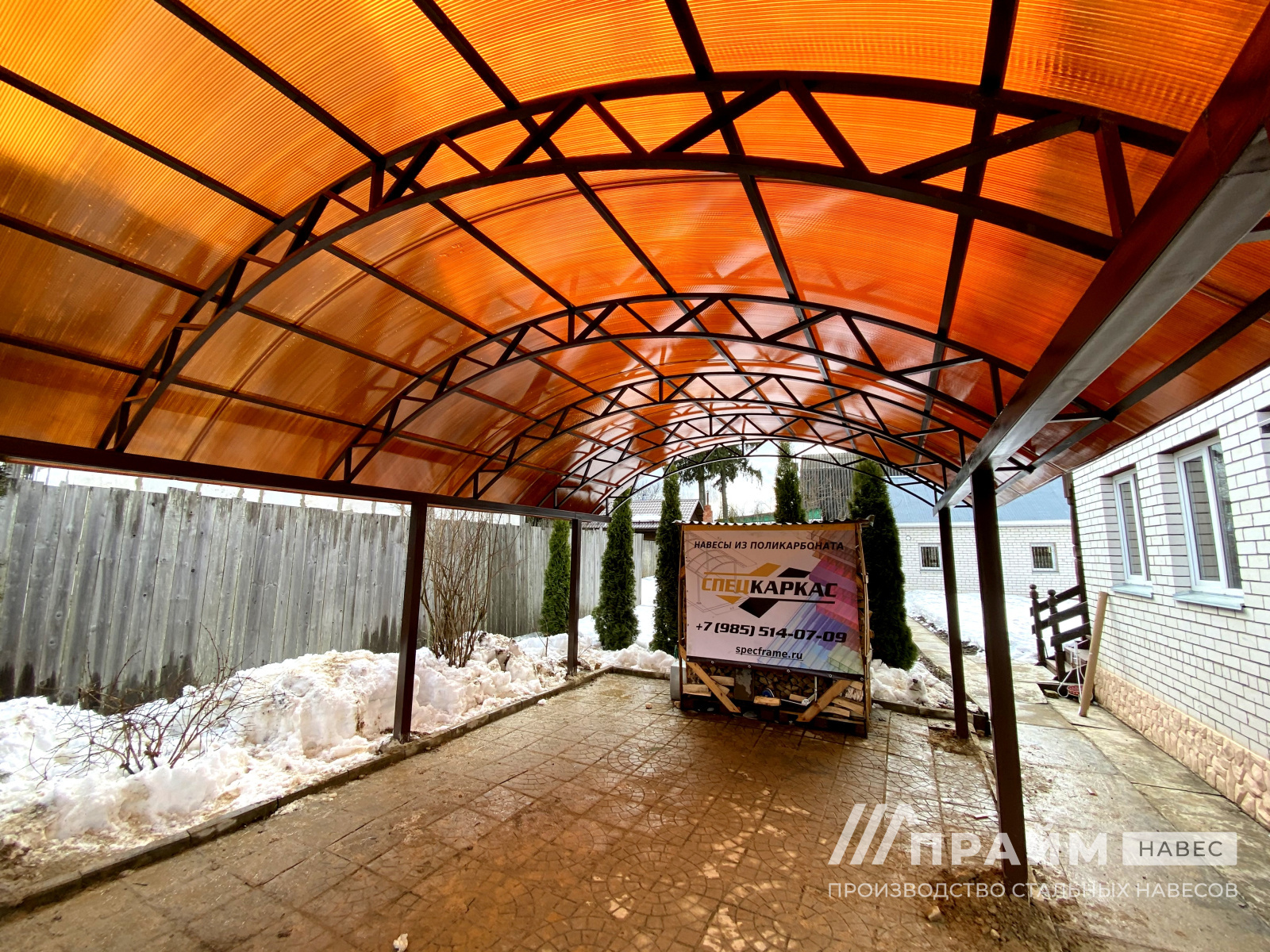 Дополнительно к каждому фото навесов из поликарбоната создано подробное описание. Указаны используемые материалы, особенности монтажа, эксплуатационные качества. Приводится точный срок выполнения заказа, его стоимость. Набор фото с несколькими ракурсами позволят полностью оценить внешний вид, размеры.